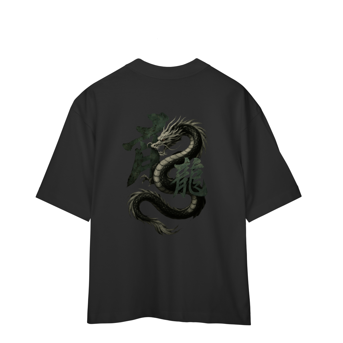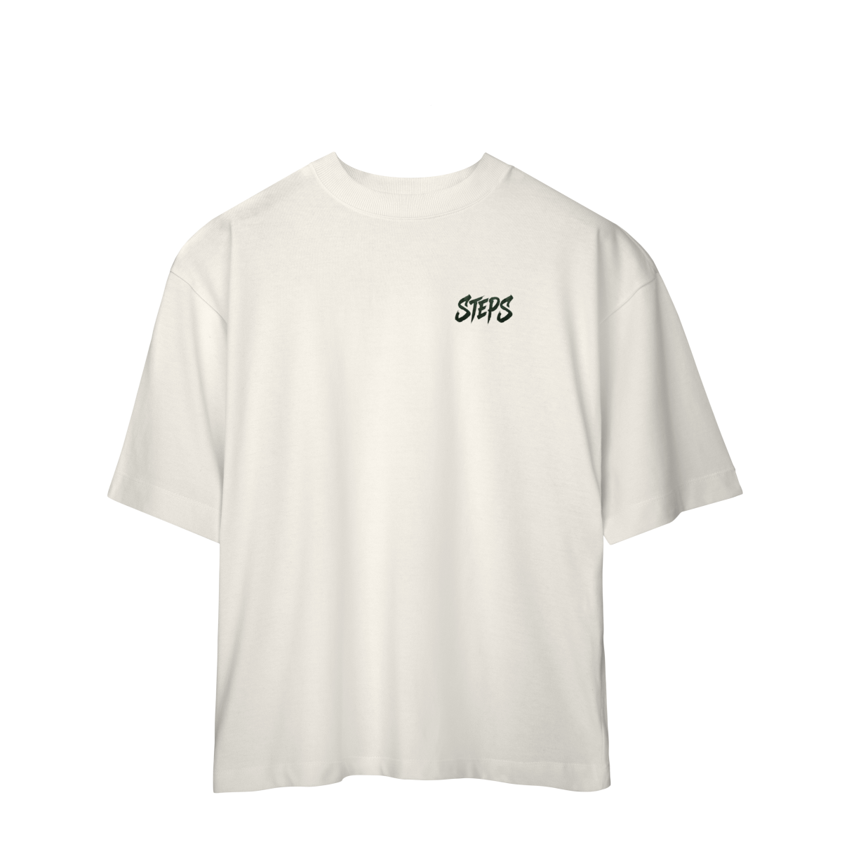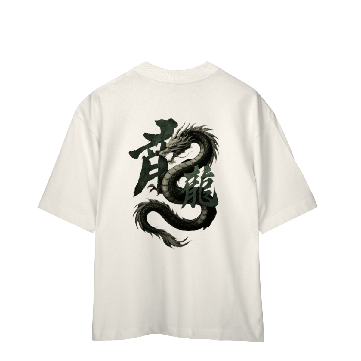 Camiseta Oversized da Steps em algodão premium preto e Off-White, traz a força do dragão oriental reinterpretada em estilo contemporâneo. Nas costas, o dragão japonês em escala imponente domina a composição, símbolo de sabedoria, poder e proteção. No peito, a logo STEPS em textura jade conecta a estética tradicional ao streetwear moderno, criando equilíbrio entre passado e presente.