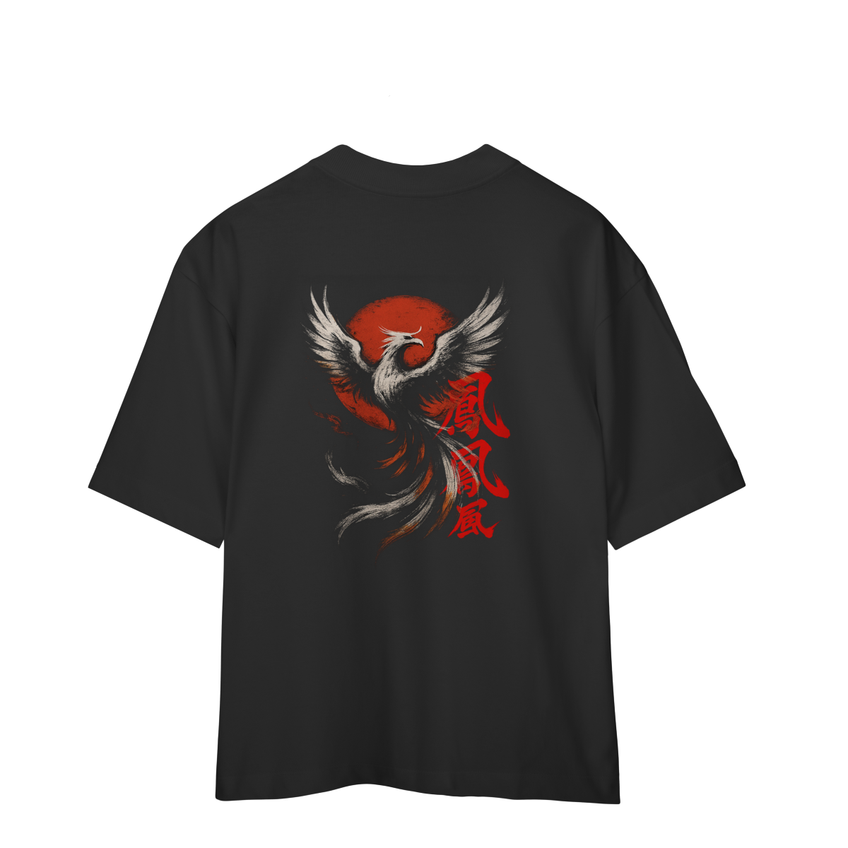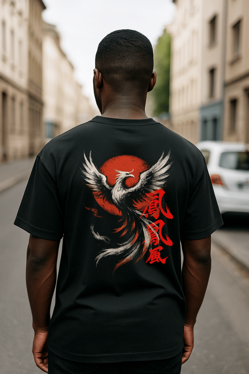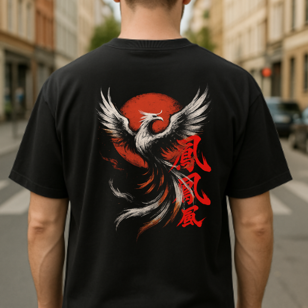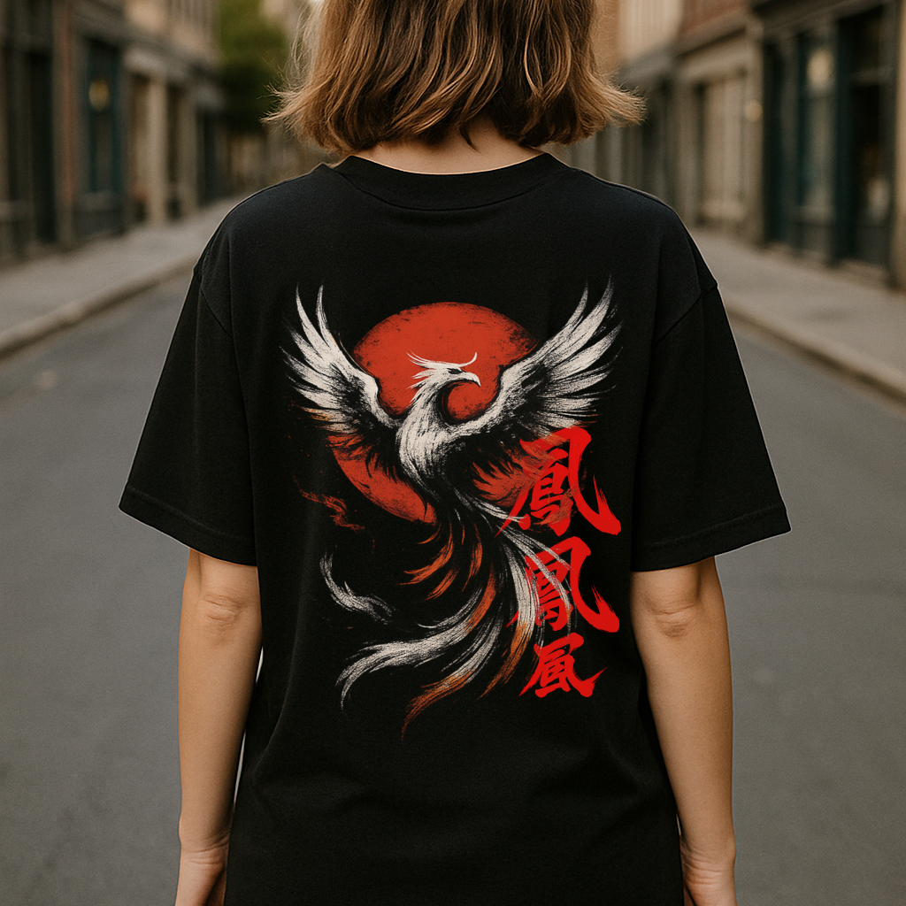 Hi no Tori – A Fênix do Sol é uma oversized que une arte tradicional japonesa e estética editorial contemporânea.